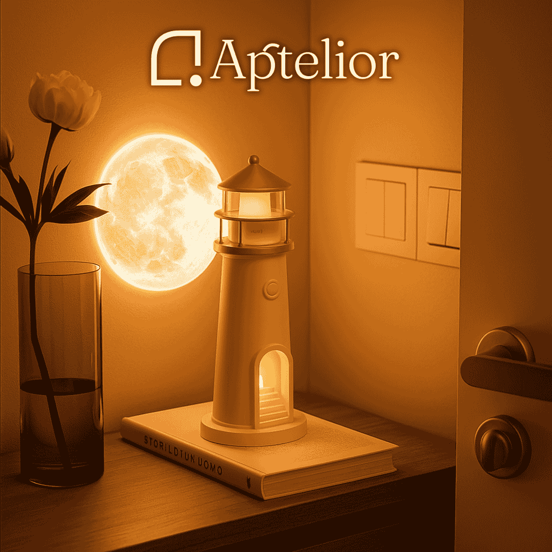 Aptelior MoonLight™ transforma las noches ordinarias en momentos de paz, combinando proyección de luna , tecnología de detección de movimiento y control de música Bluetooth opcional en un diseño de faro escultural que calienta cualquier espacio.